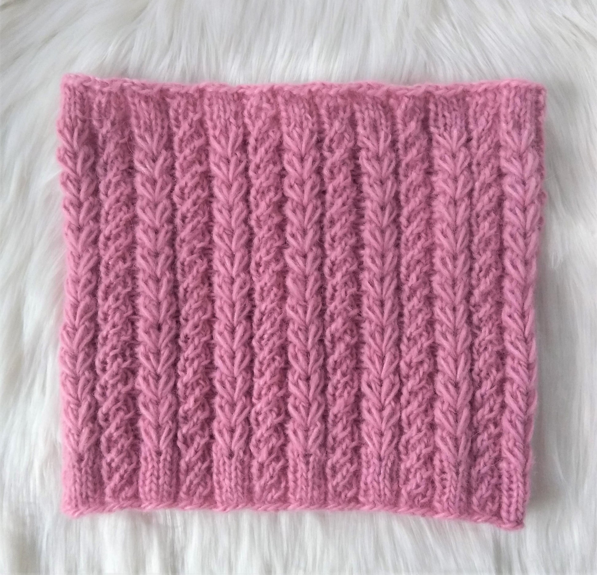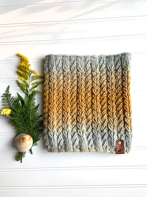 The coordinating cowl to the Amortentia toque features the same spiraling stitches framing heart shaped dip stitches.
