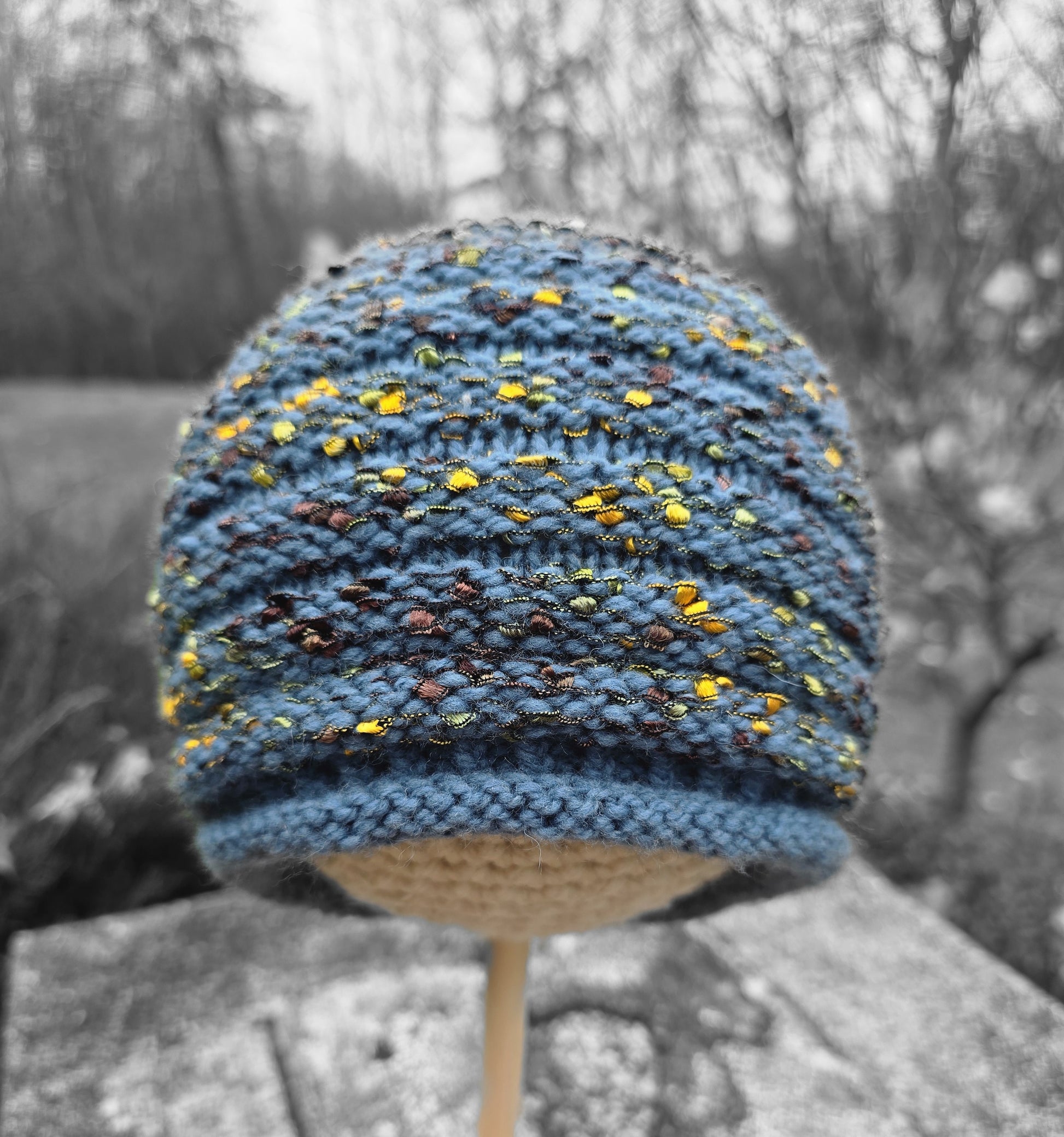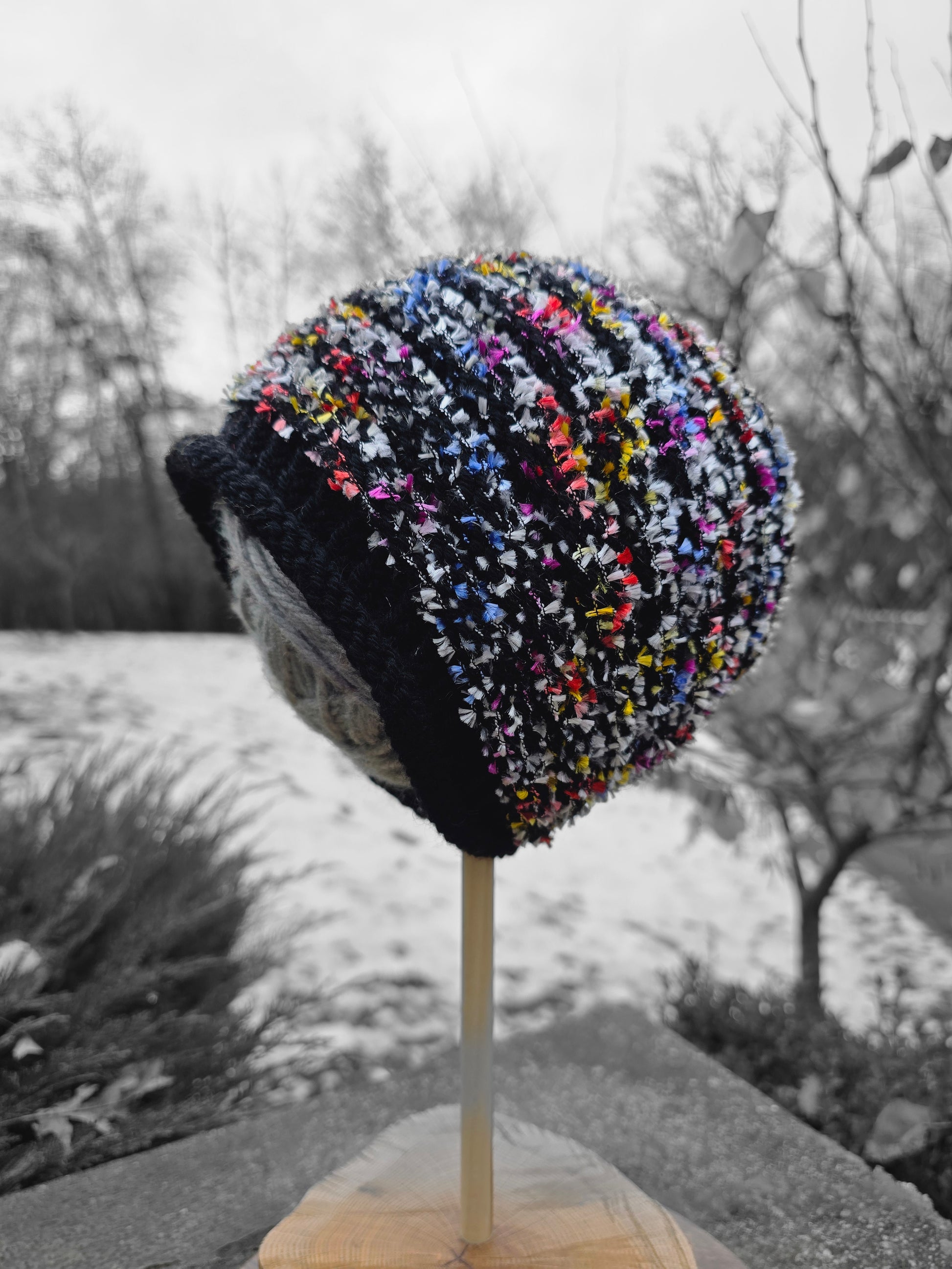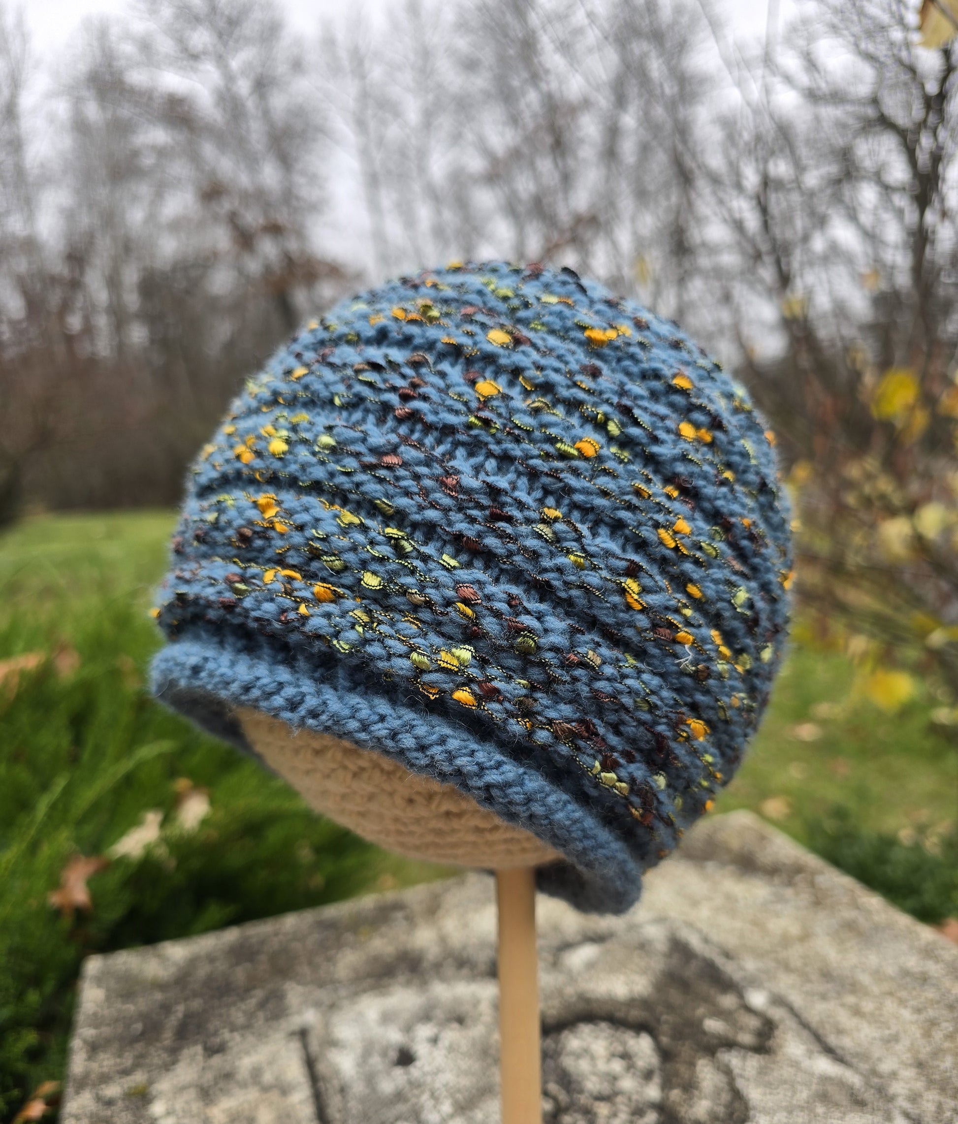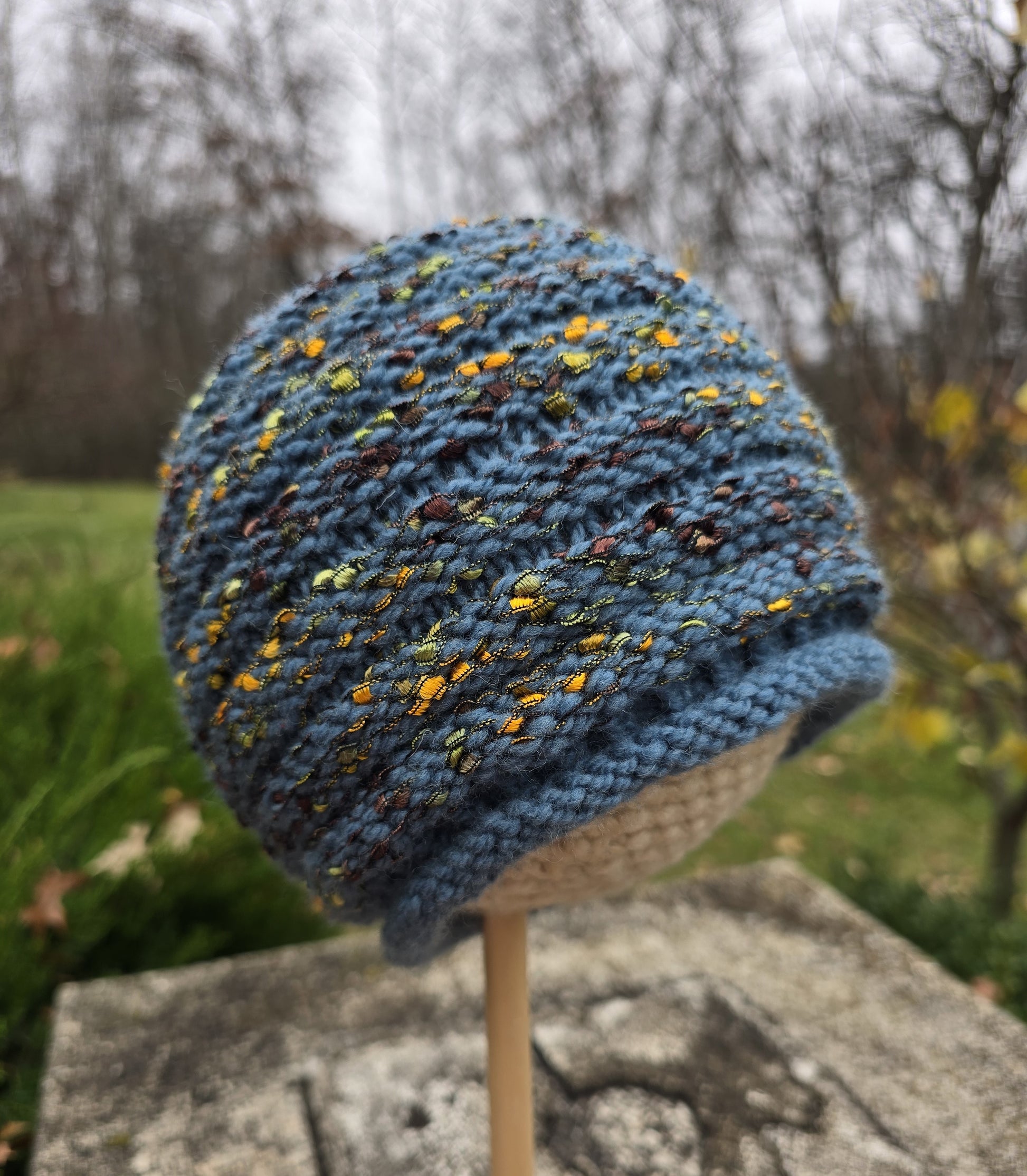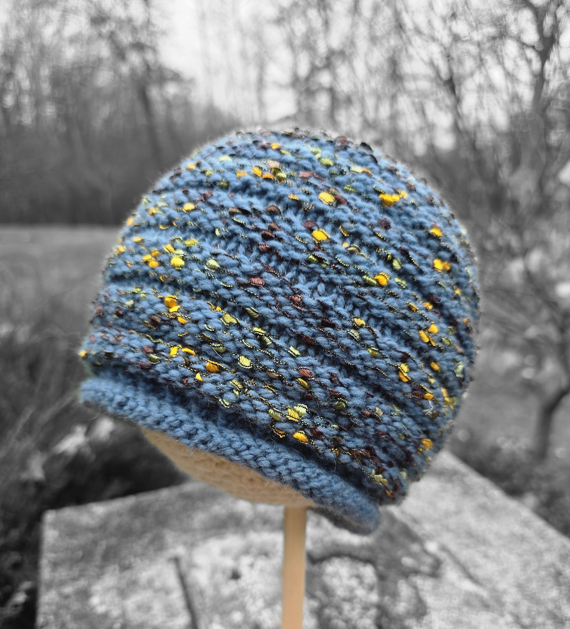 This pattern/design can be used with several different types of novelty yarn. It can be difficult to find patterns for these yarns, with their different fibers and textures, but it’s a different game when they’re held double with a “normal” yarn we’re accustomed to. Alternating yarn held double with a single strand, this beautiful texture is enhanced and the concentric circles stand out when worn. The crown tapers beautifully with the continued stitch pattern.