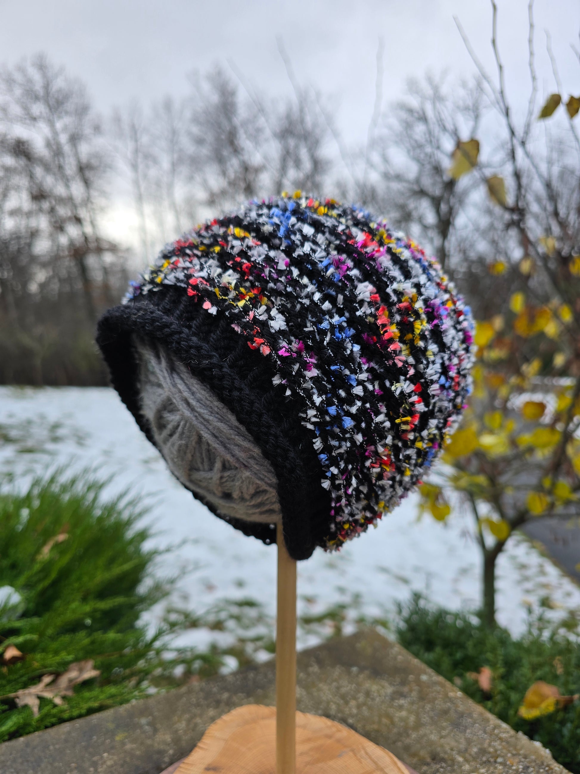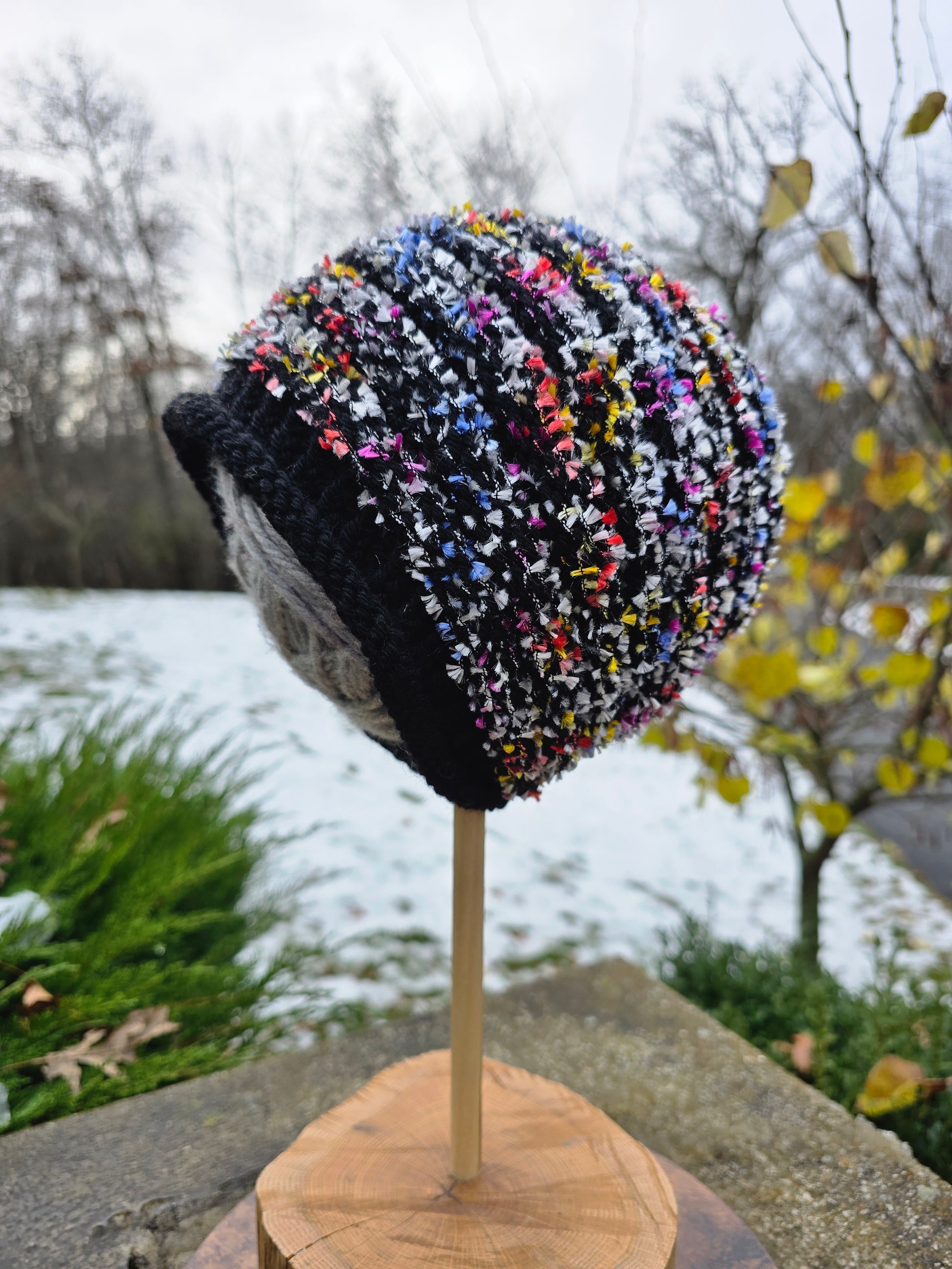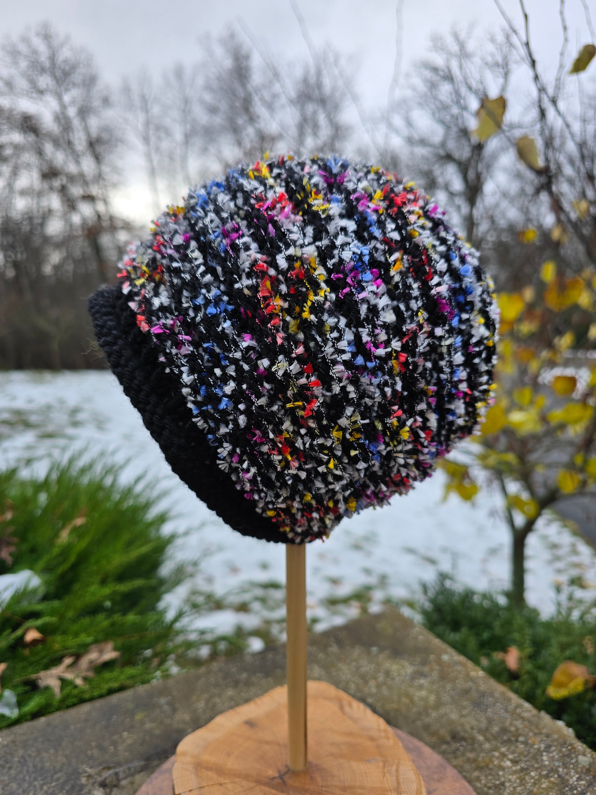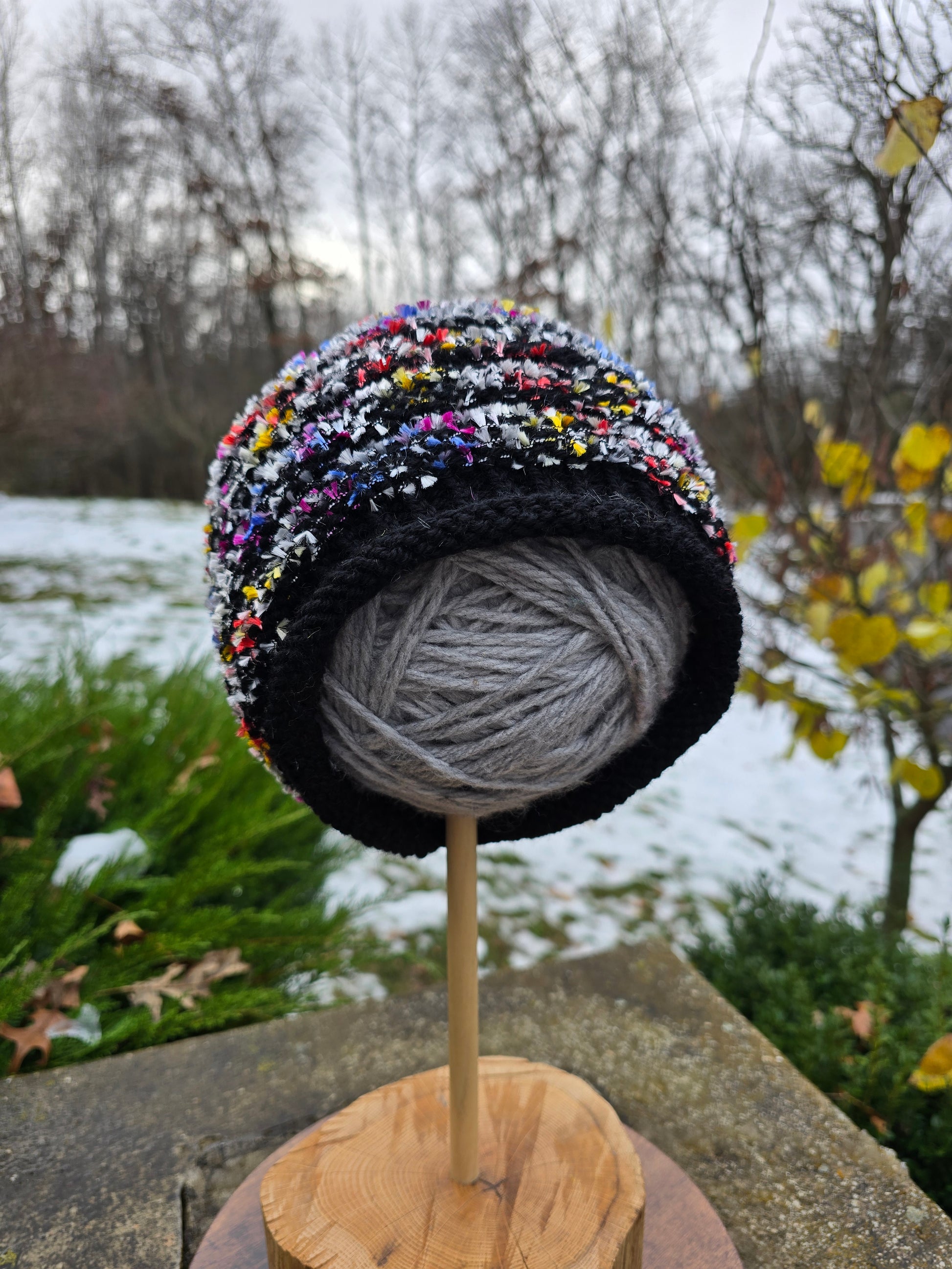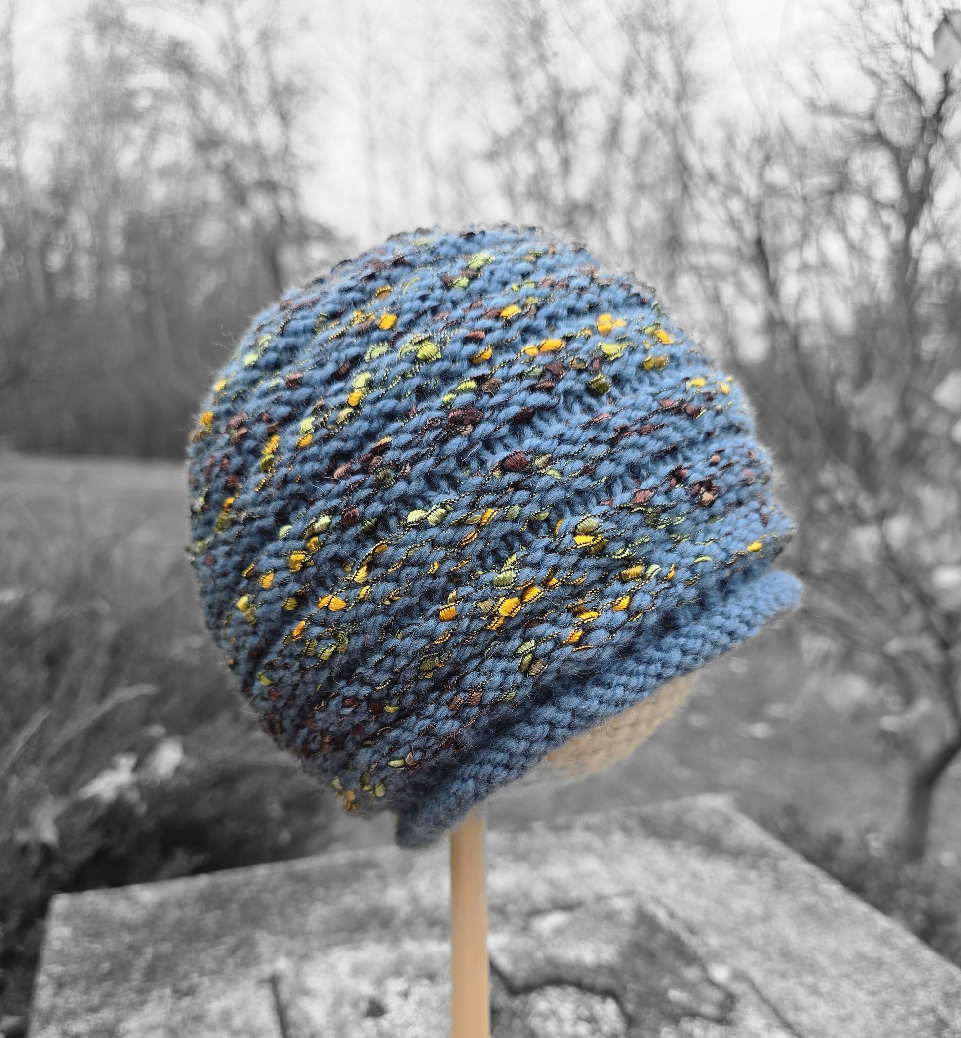 This pattern/design can be used with several different types of novelty yarn. It can be difficult to find patterns for these yarns, with their different fibers and textures, but it’s a different game when they’re held double with a “normal” yarn we’re accustomed to. Alternating yarn held double with a single strand, this beautiful texture is enhanced and the concentric circles stand out when worn. The crown tapers beautifully with the continued stitch pattern.