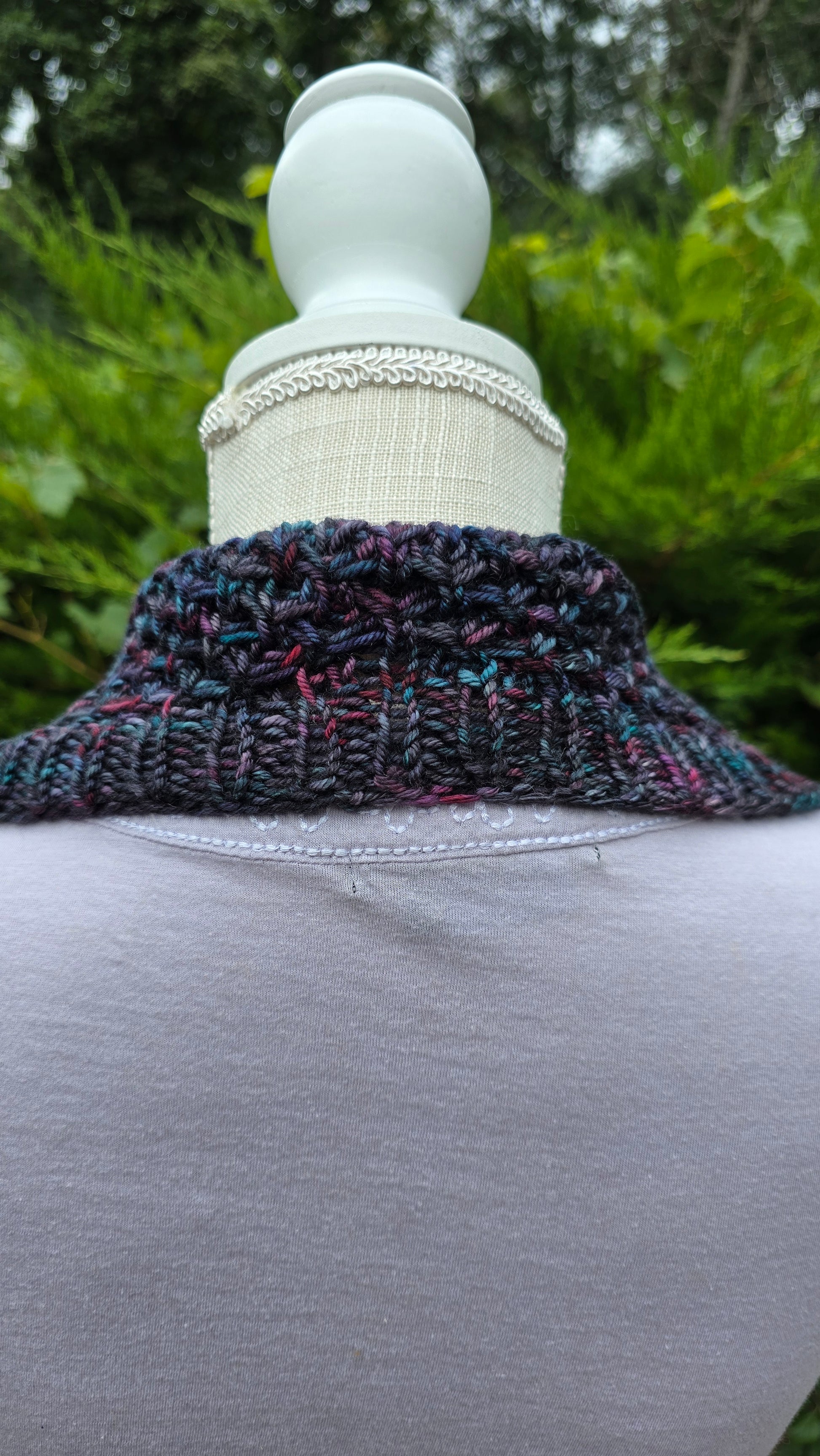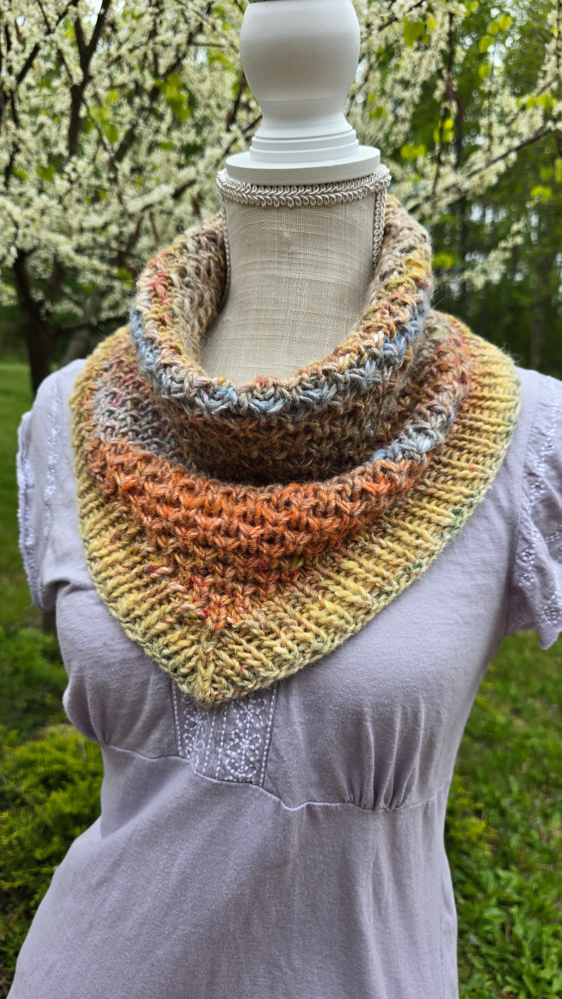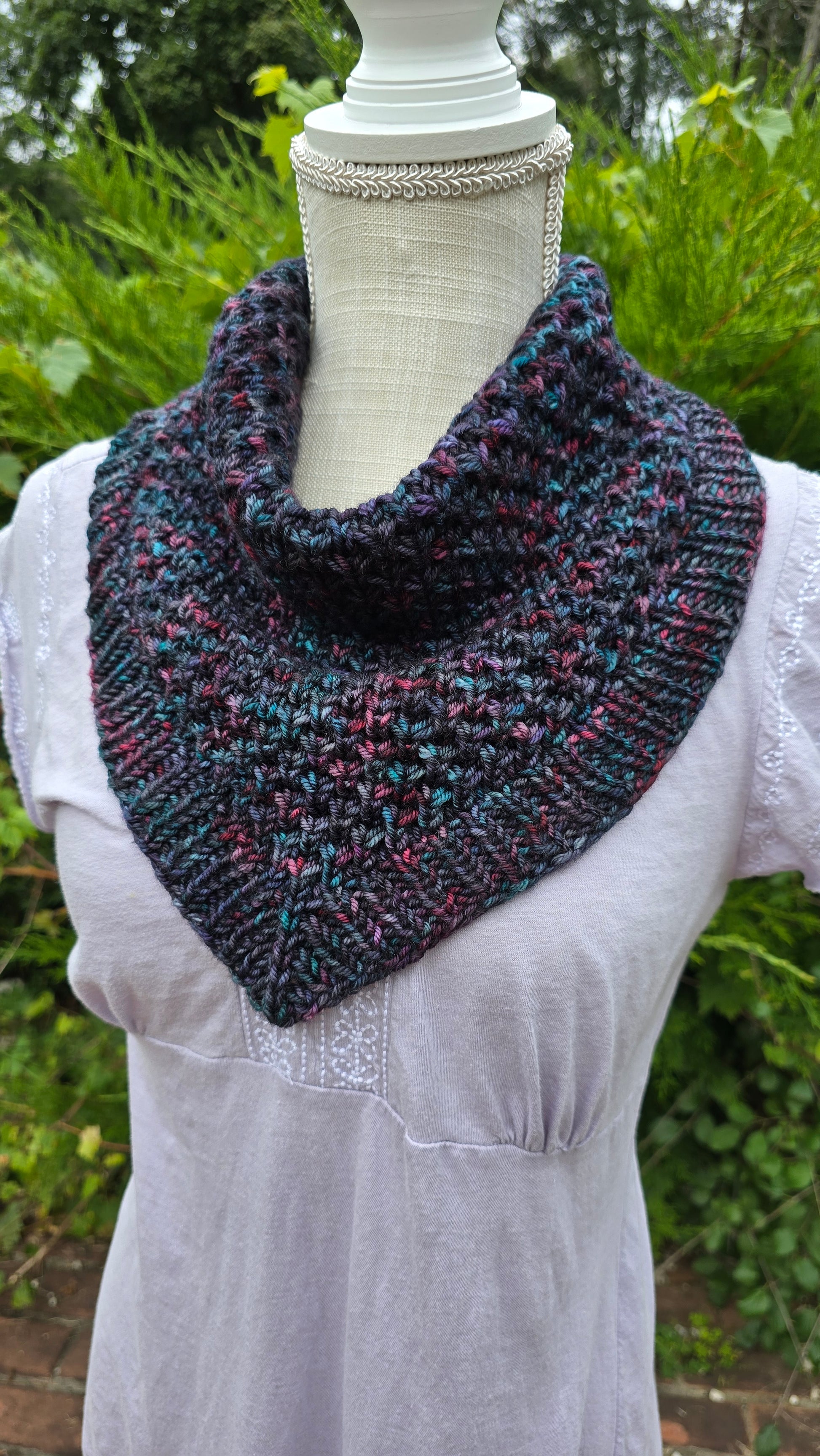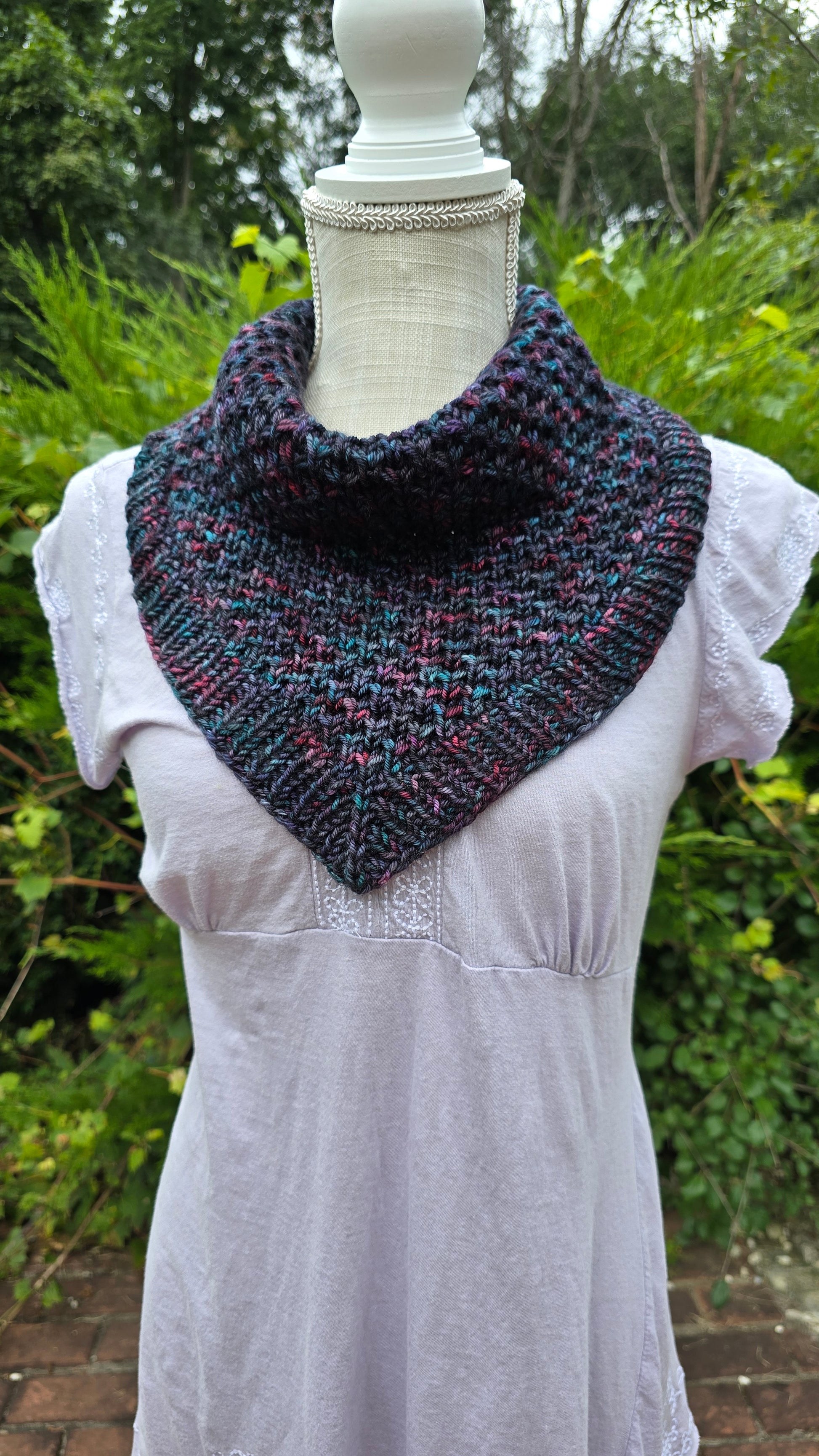 A beautiful textured bandana cowl is a wardrobe staple. It's easy to style without a lot of bulk in the back of the neck. Much like my other bandana cowl designs, this is a seamless knit started in the round, using short rows (German) to provide the shaping from the bottom upwards and out. It is then joined back together in the back to lengthen. This dense and squishy stitch pattern will keep you cozy and snug in the chillier months.