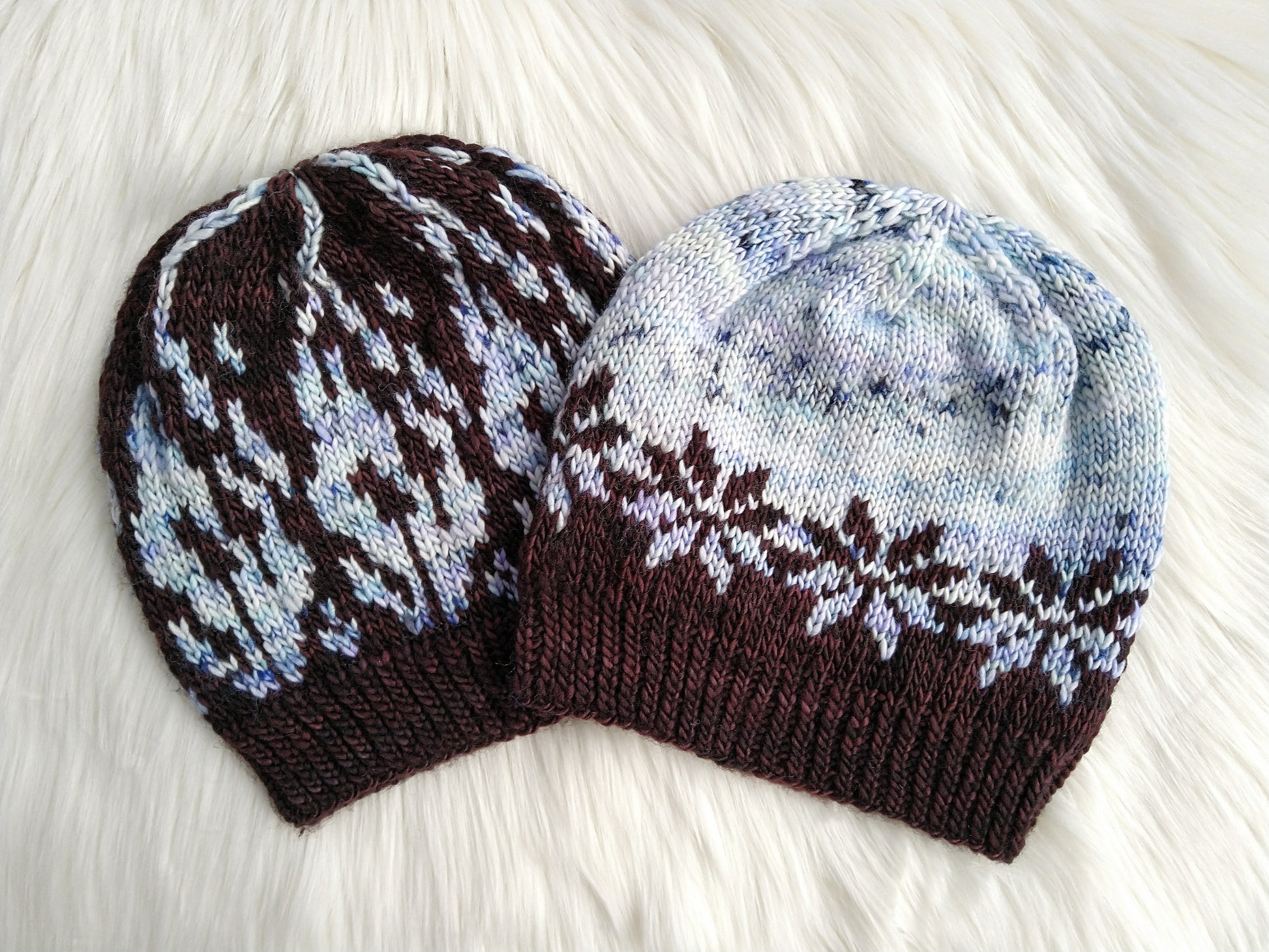 Fire and Ice. Bluebell Flames and Glacius. Capturing these magical charms and spells with these fun fair isle designs in Dream in Color Riley! With 2 skeins in contrasting colors, you can make both hats and either a Glacius headband or a child sized Glacius hat!
