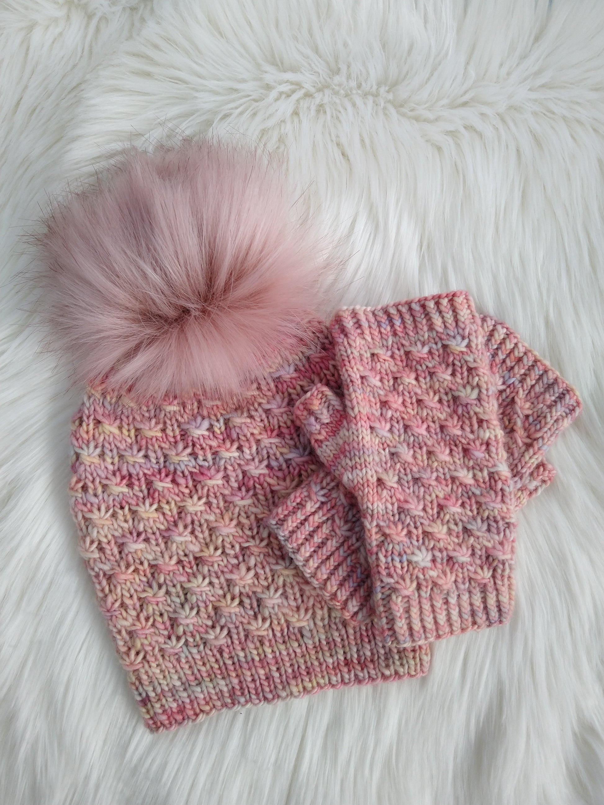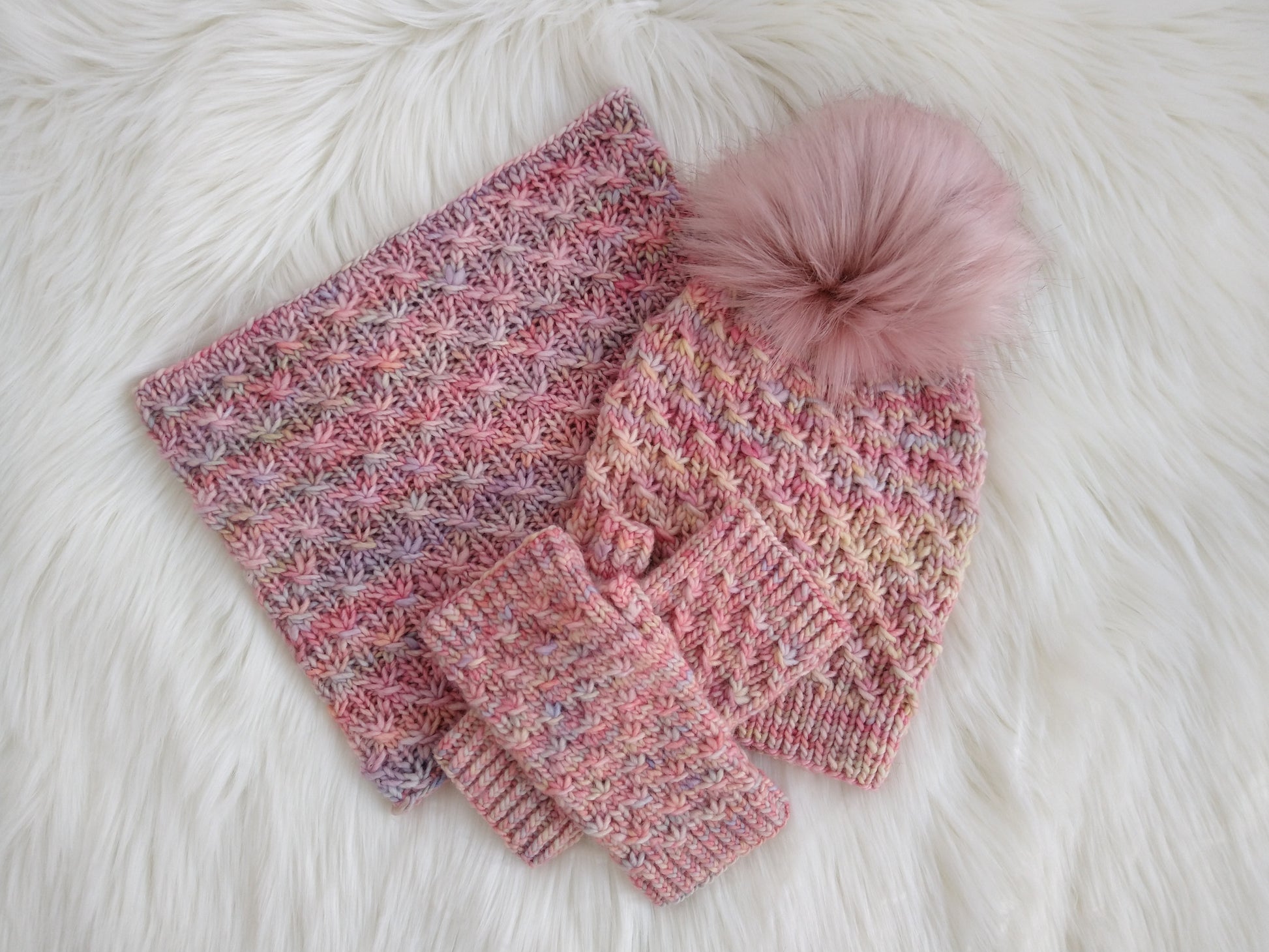This set contains the Granger Toque, Fingerless Mitts, and Cowl. Each of these patterns include instructions for multiple yarn weights.