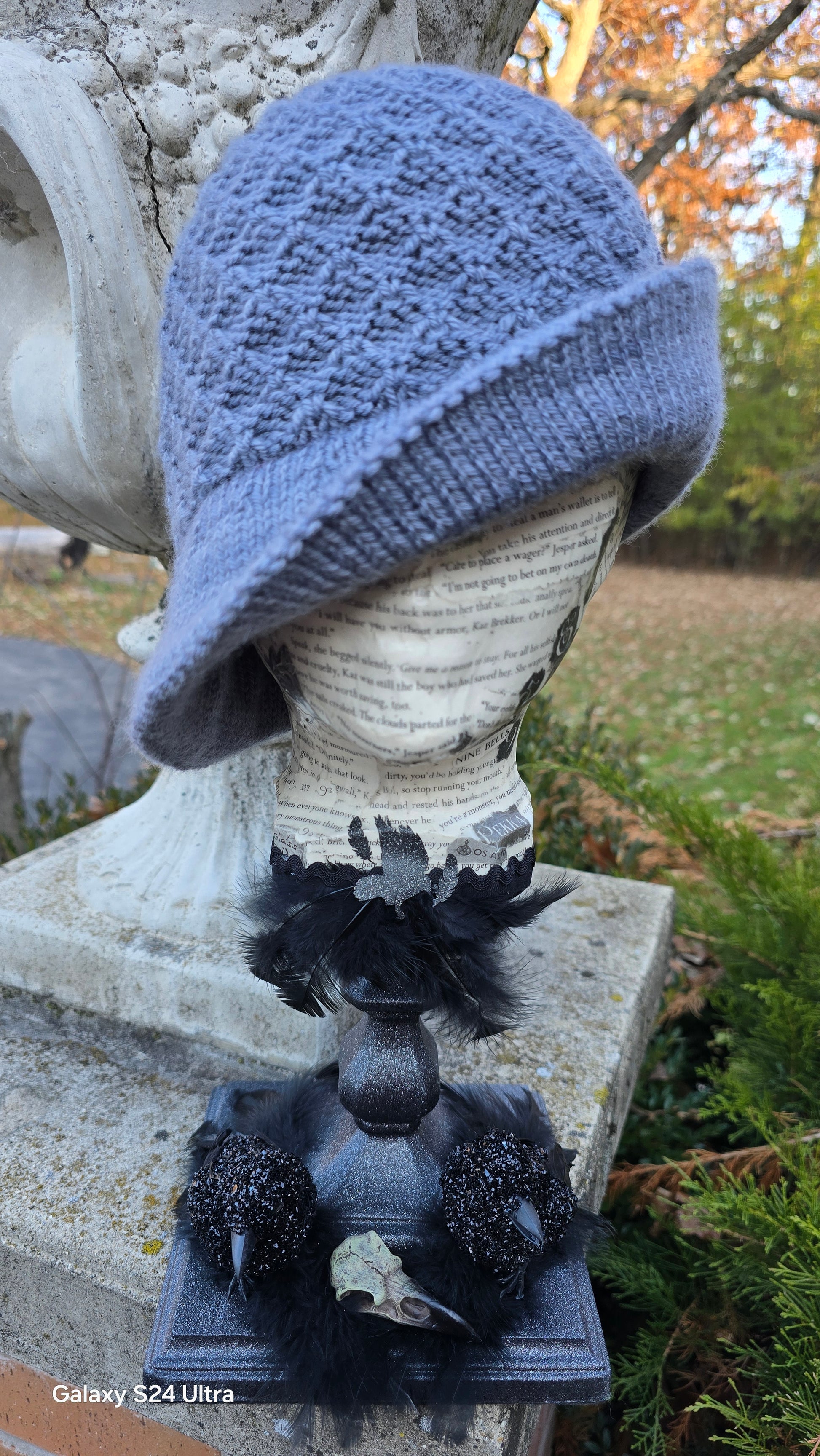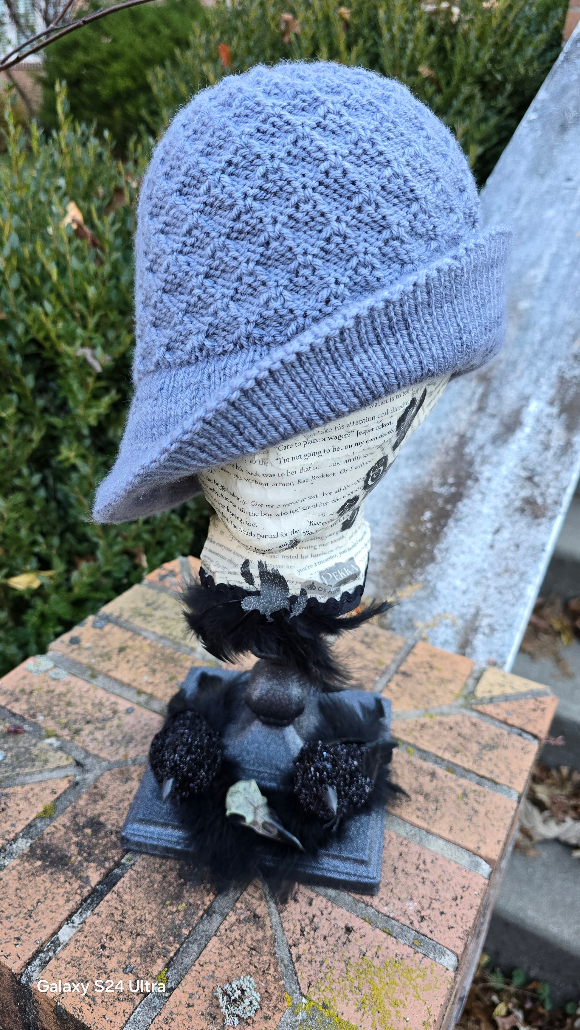 This design is named for Jesper Fahey from the Six of Crows duology by Leigh Bardugo. He is a charming and quick-witted sharpshooter with a penchant for gambling. He often wears a cocky smile and is known for his flashy style and love of guns. The textured pattern reminds me of clubs or spades from a deck of cards. Incorporating into a cloche just felt right for Jesper’s style, especially when the crown ends up like a bullseye!