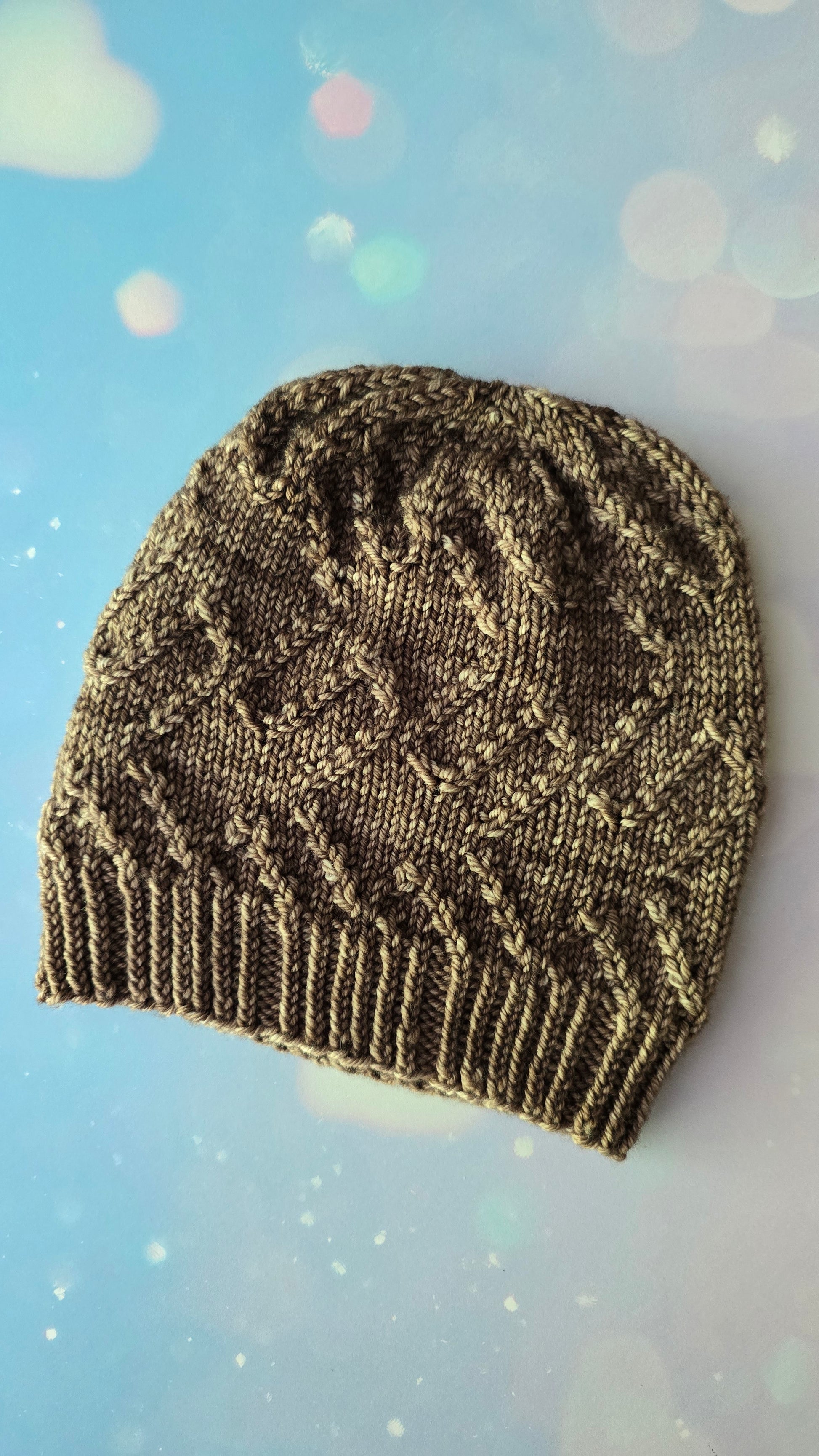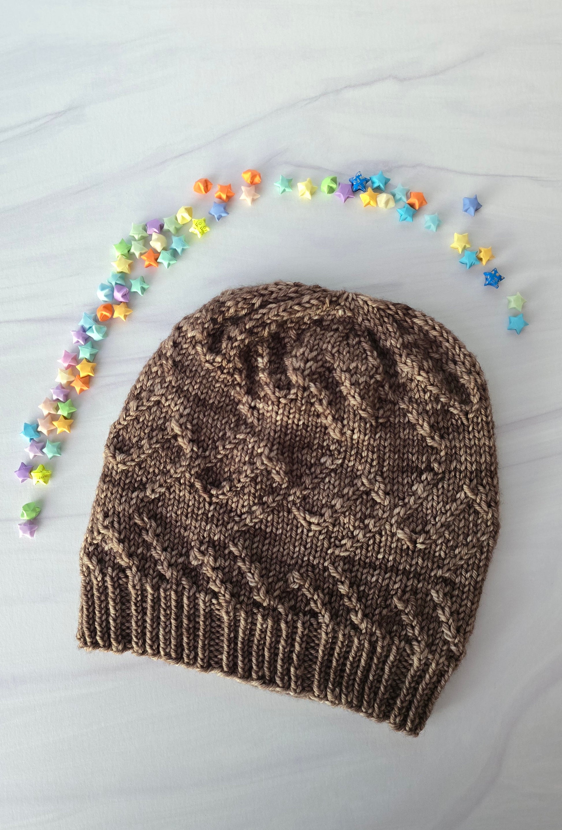 The pattern is written and charted, allowing you to knit using you preferred method. It’s a fitted style with slouch in the crown. Length can be adjusted as there are 4 places to begin decreasing.