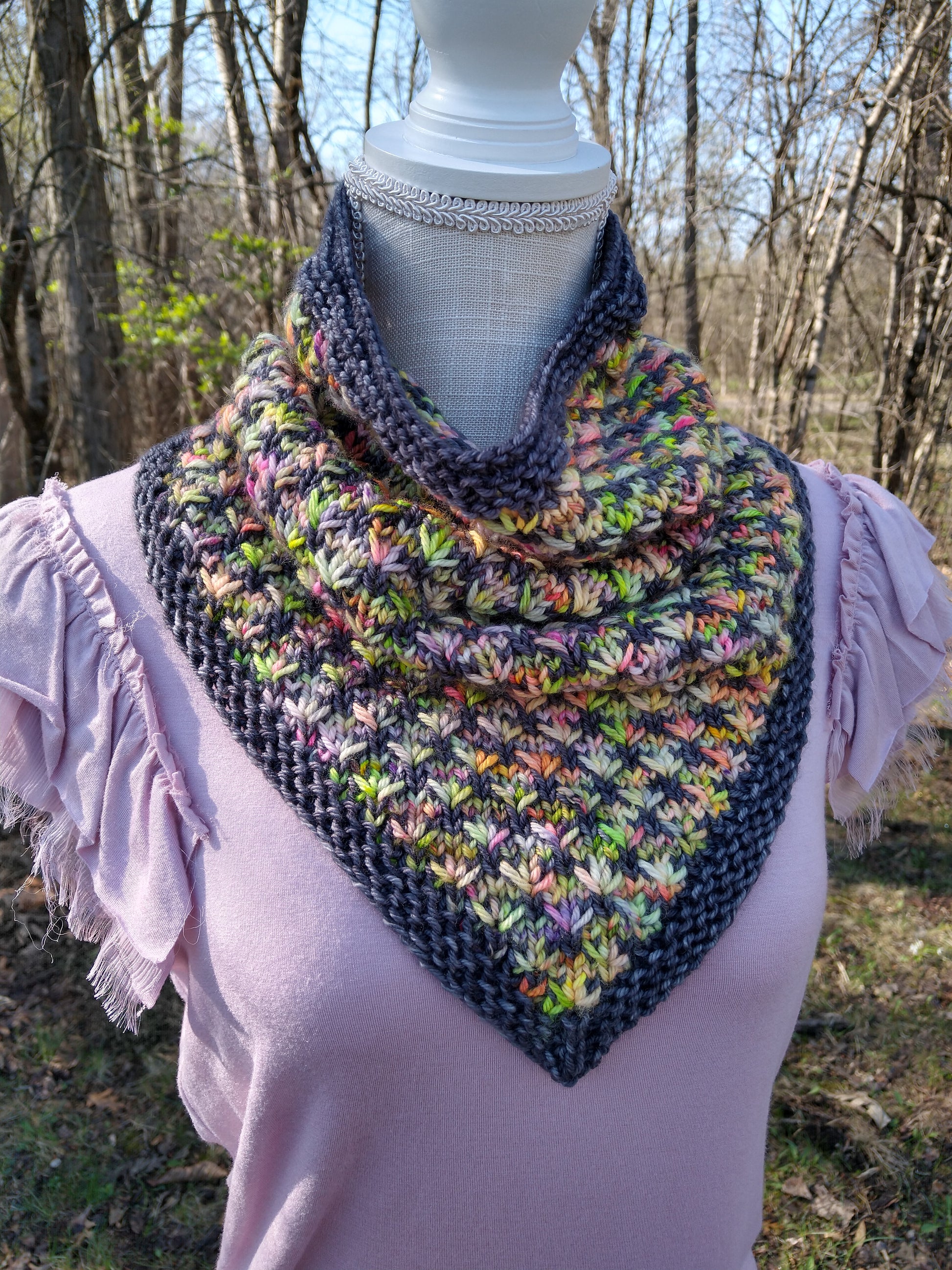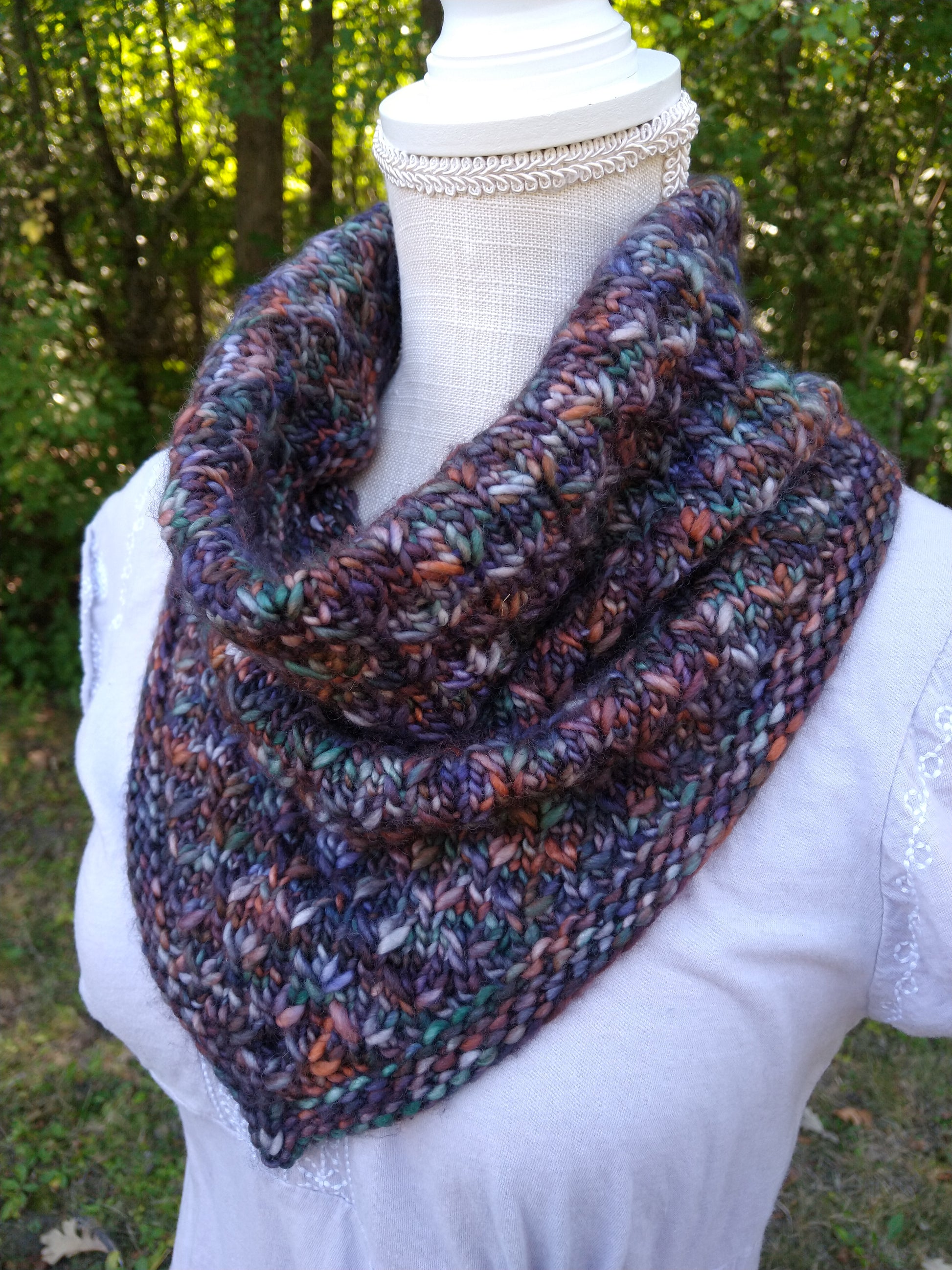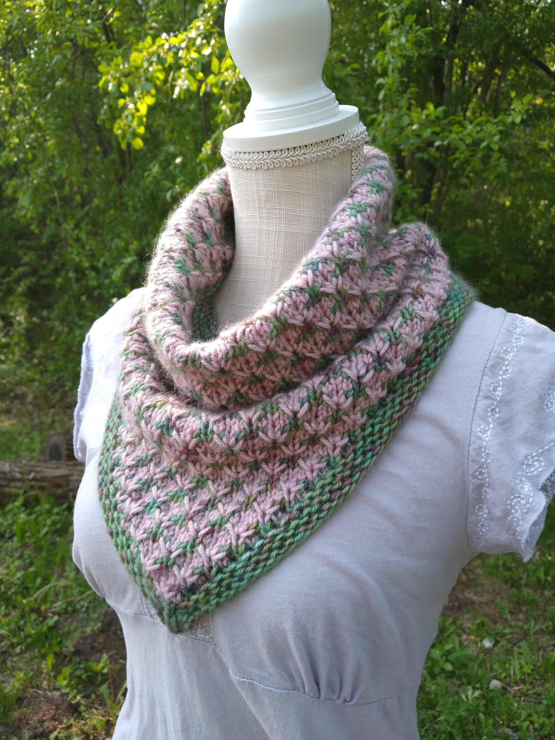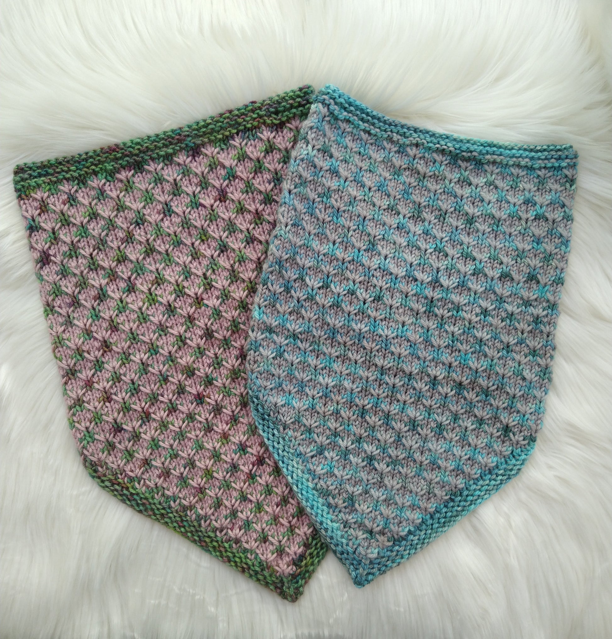 The bandana cowl shape is my new favorite, shorter in the back for less bulk and longer in the front to show off more of the pattern. This design is started in the round, then, using short rows to shape the front, later joined back together to lengthen the top. Make it longer to add more scrunchy warmth or keep it short for a lightweight accessory. I like to fold over the top!
