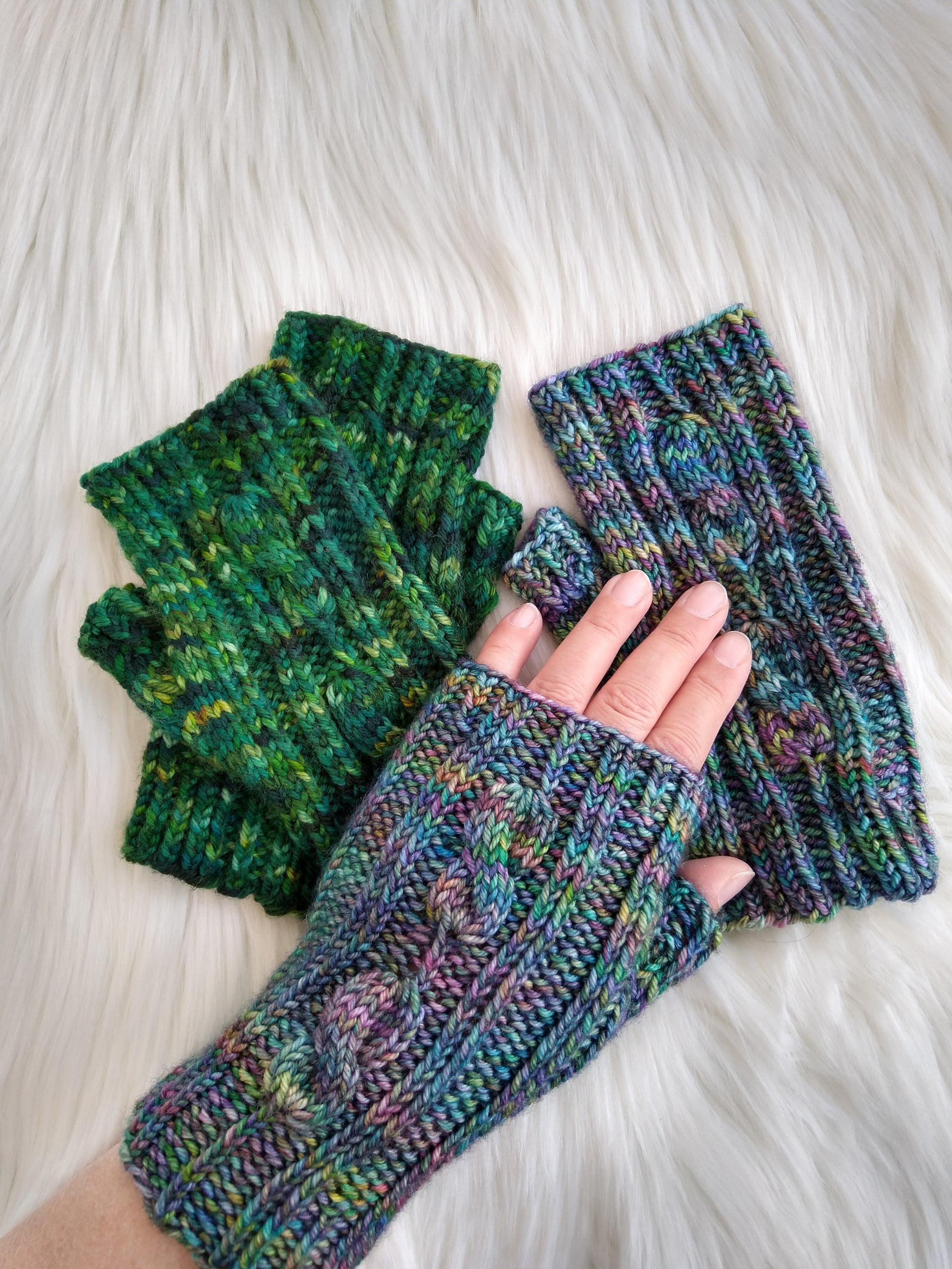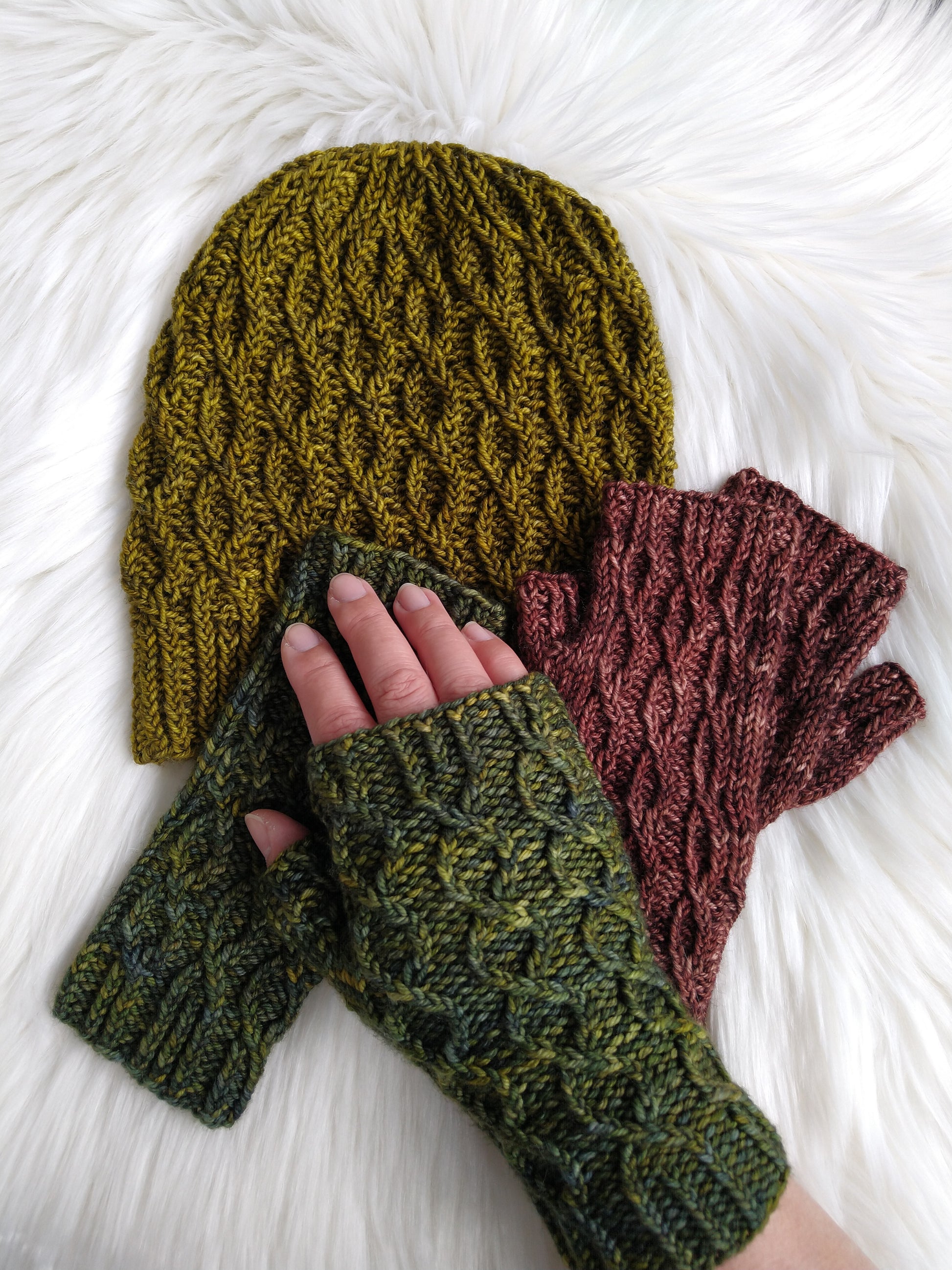 Finally, the Serpensortia set. This also came from designing the Salazar Hat. The fingerless mitts is written for 2 weights, worsted and light bulky, and with some simple addition or subtraction is easily adjustable for fit.