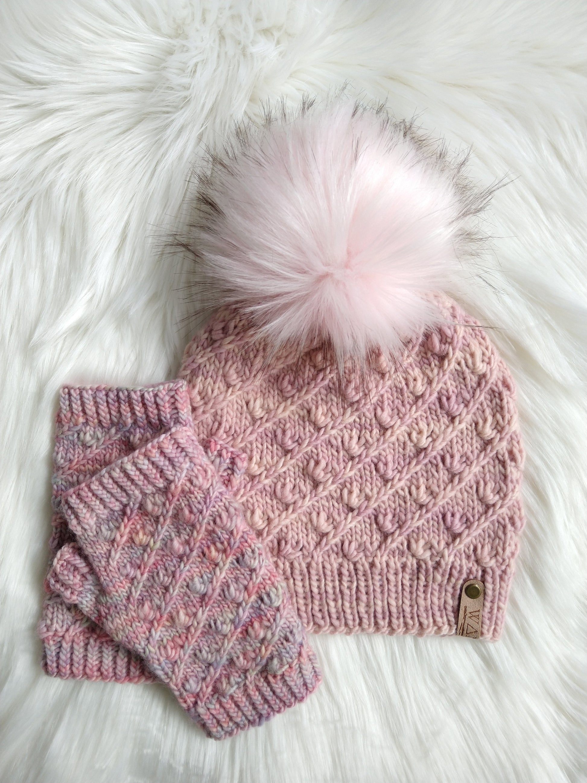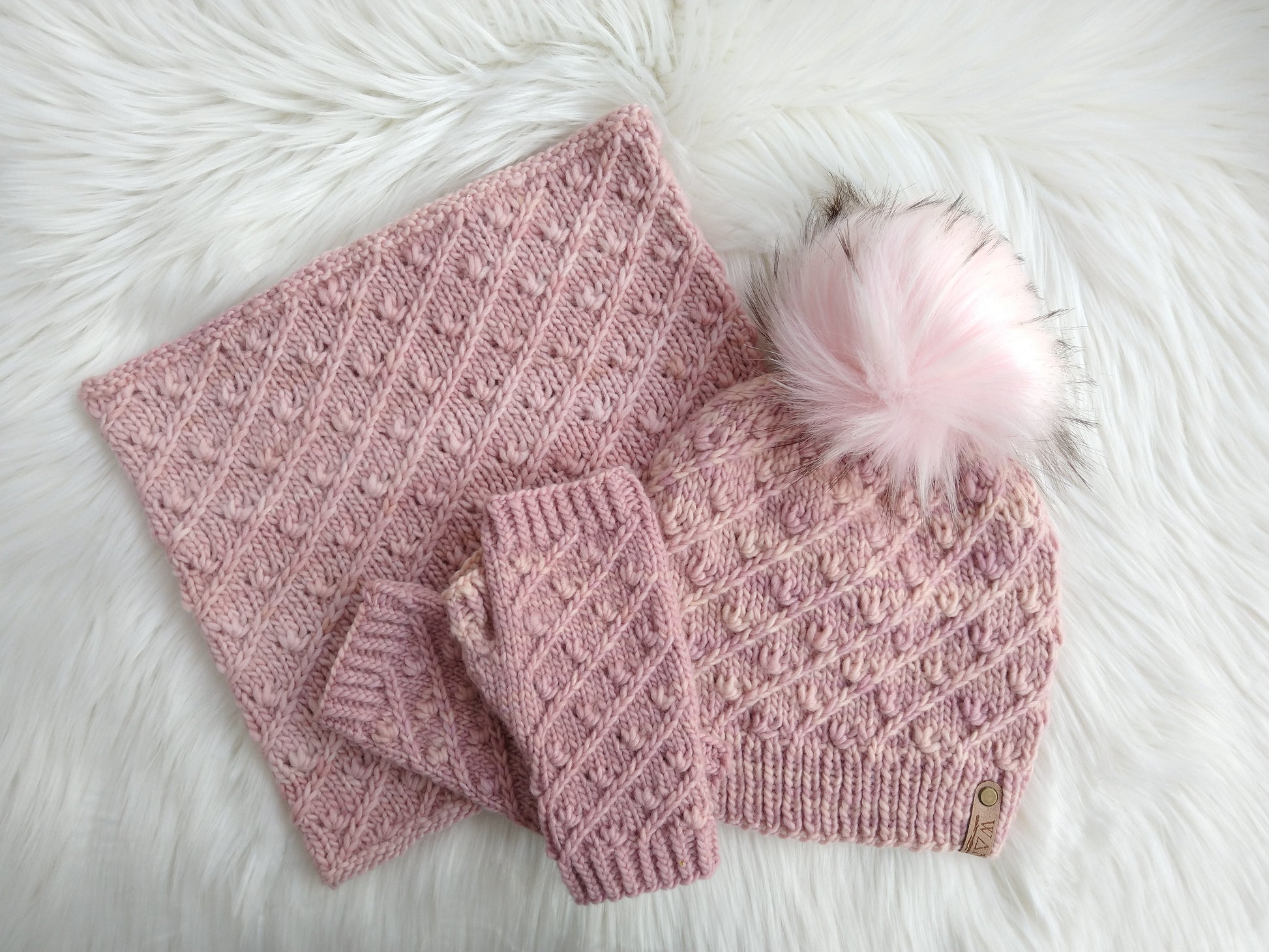 This set contains the Veela Beanie, Fingerless Mitts, Cowl, and Scarf. Each of these patterns include instructions for multiple yarn weights.
